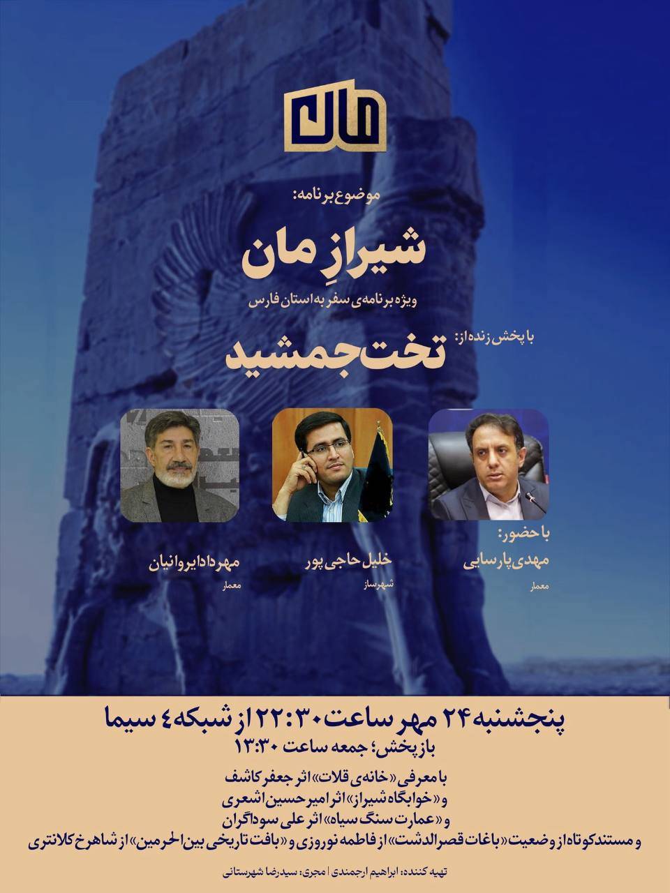 برنامه «مان» که هر هفته پنجشنبه شبها به نقد و بررسی تخصصی معماری و شهرسازی در ایران میپردازد این هفته به مناسبت رویداد ملی «ایران جان» و هفته «فارس» ایران به معماری شهر شیراز خواهد پرداخت.