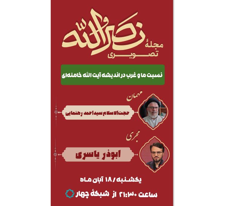 مجله تصویری «نصرالله» در برنامه امشب، با حضور حجت الاسلام دکتر سیداحمد رهنمایی، استاد دانشگاه و پژوهشگر حوزه تمدن اسلامی، با موضوع نسبت ما و غرب در اندیشه آیتالله خامنهای، به کاوش چیستی و چگونگی مواجهه تمدنی ایران اسلامی با جبهه استکبار غربی میپردازد و دریچهای به منظومه فکری رهبر انقلاب میگشاید که با تحلیلهای ژرف، پیوندهای پنهان سلطهطلبی فرهنگی، استعمار فرانو، افول هژمونیک آمریکا و لزوم مقاومت فعال تمدنی را برای مخاطبان آشکار میسازد. این برنامه در ساعت ۲۱:۳۰ یکشنبه ۱۸ آبان از شبکه چهار پخش می شود.