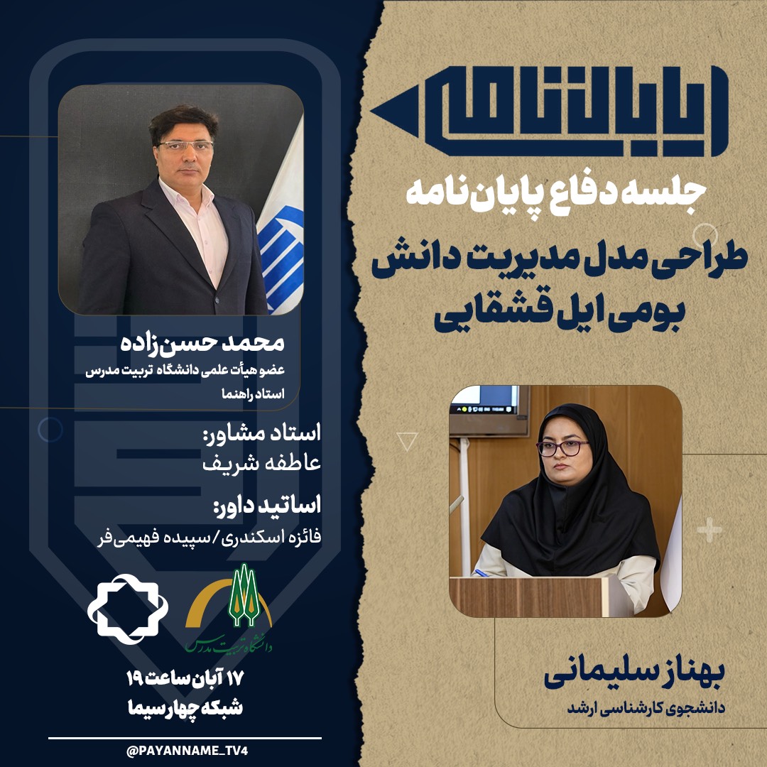 جلسه دفاع پایاننامه خانم بهناز سلیمانی در برنامه این هفته پایاننامه با موضوع پایاننامه «طراحی مدل مدیریت دانش بومی ایل قشقایی» از دانشگاه تربیت مدرس در روز ۱۷ ابان از شبکه چهار پخش خواهد شد.